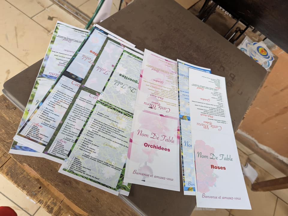 • Etape et délai: Lorsque vous envoyez les noms et information sur le mariage, nous faisons un montage que nous vous envoyons pour validation. Apres la validation nous livrons en 24h. Si vous êtes hors de Yaoundé nous livrons en 2jours, ce qui inclue une journée pour l’expédition. Vous pouvez également nous mettre en contact avec votre responsable de la décoration de sale, pour valider les motifs et les couleurs